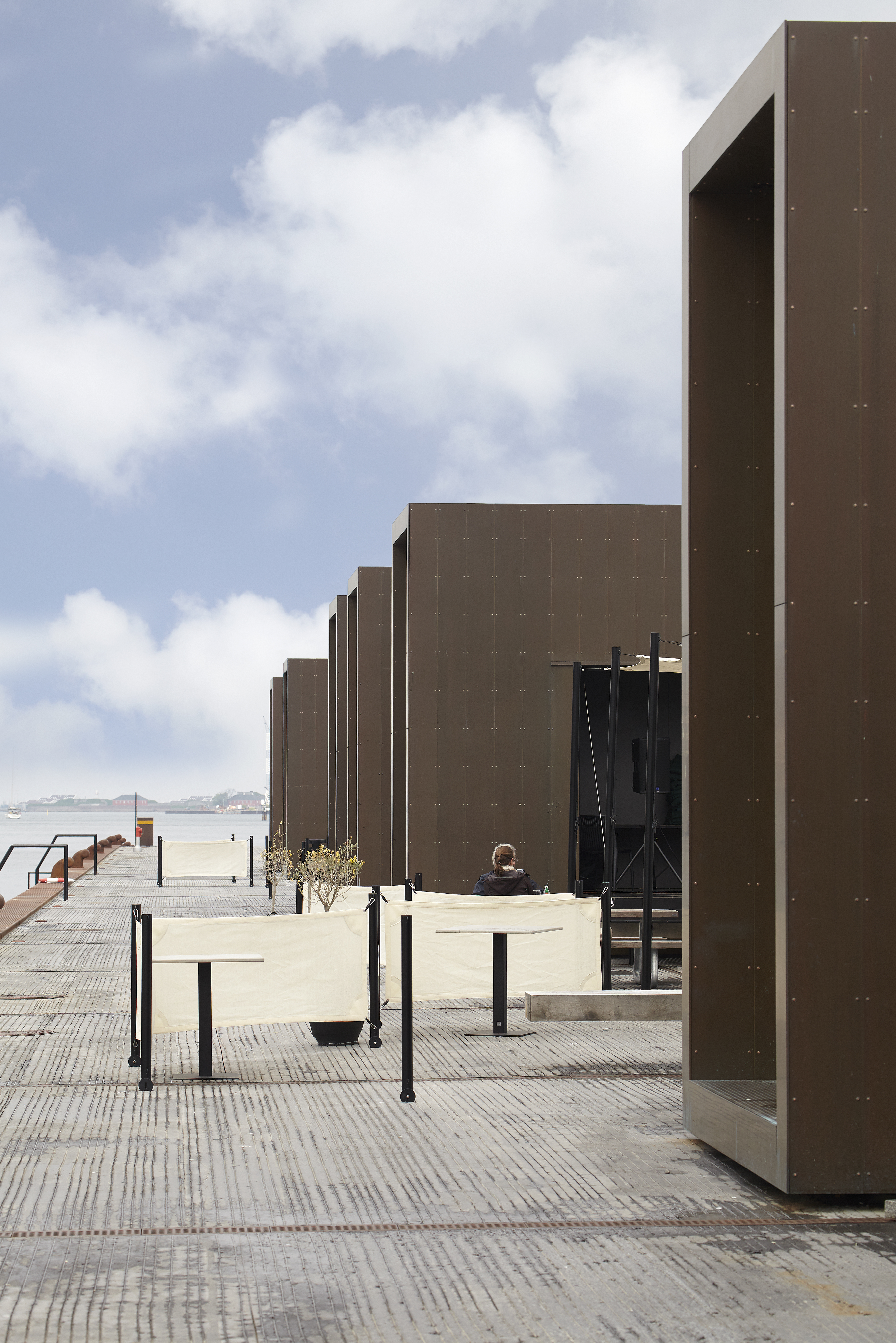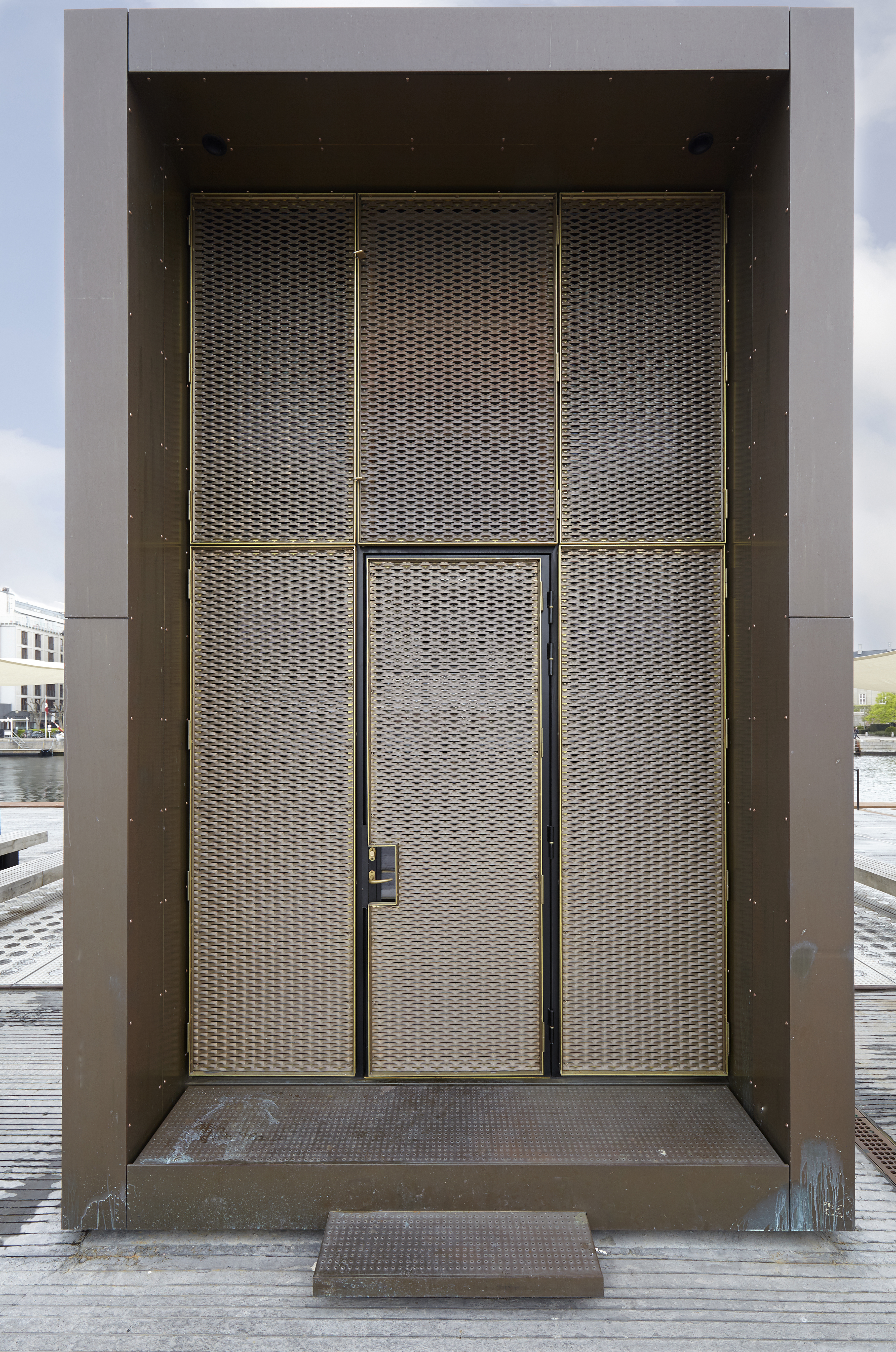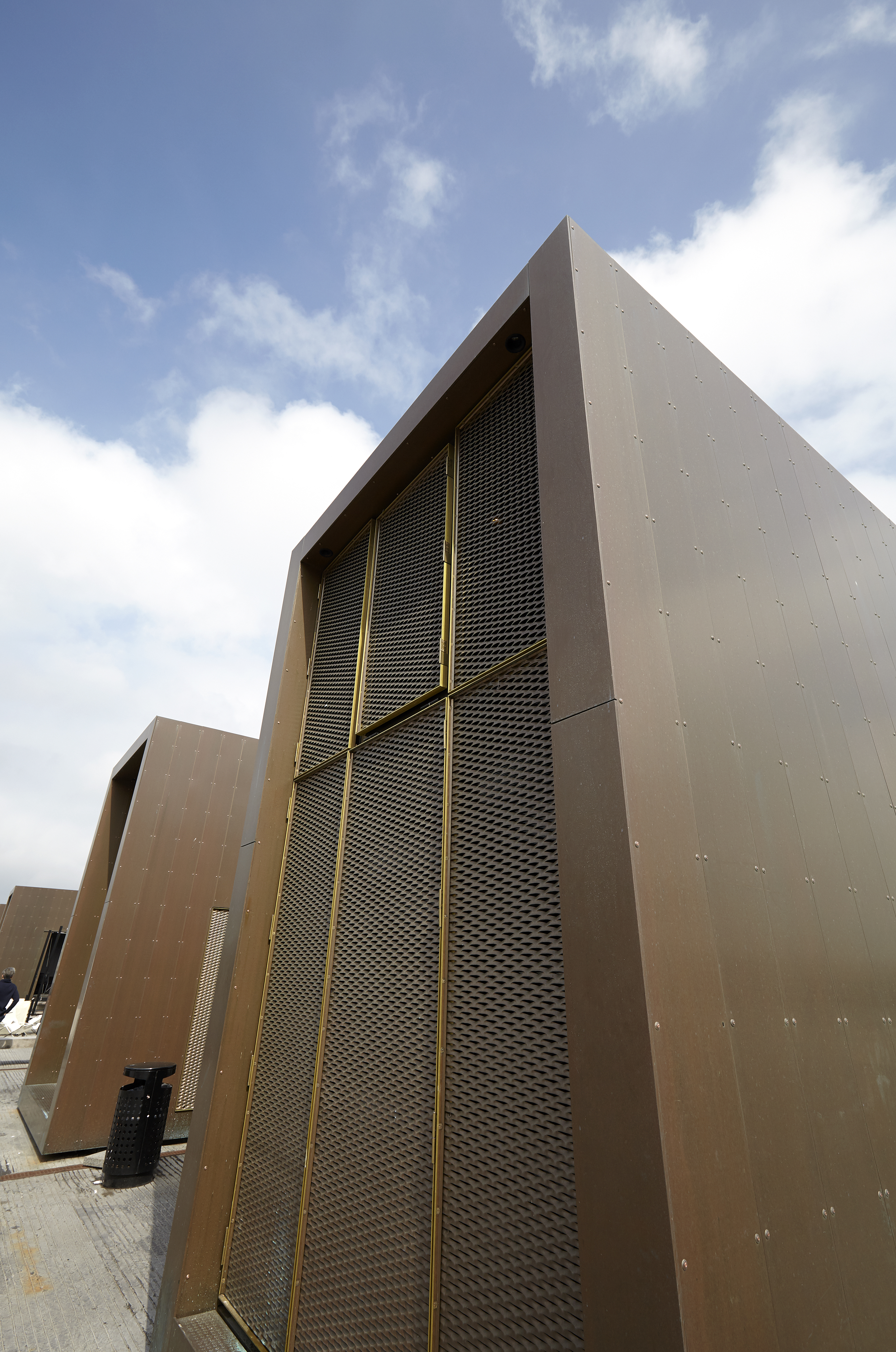 The pavilions are clad in Tombak CuZn15, which is a KME material, supplied by Metalcenter Group. The design of the facade is very special, as it was a wish that the thick plates could be seen from the front of the pavilions.