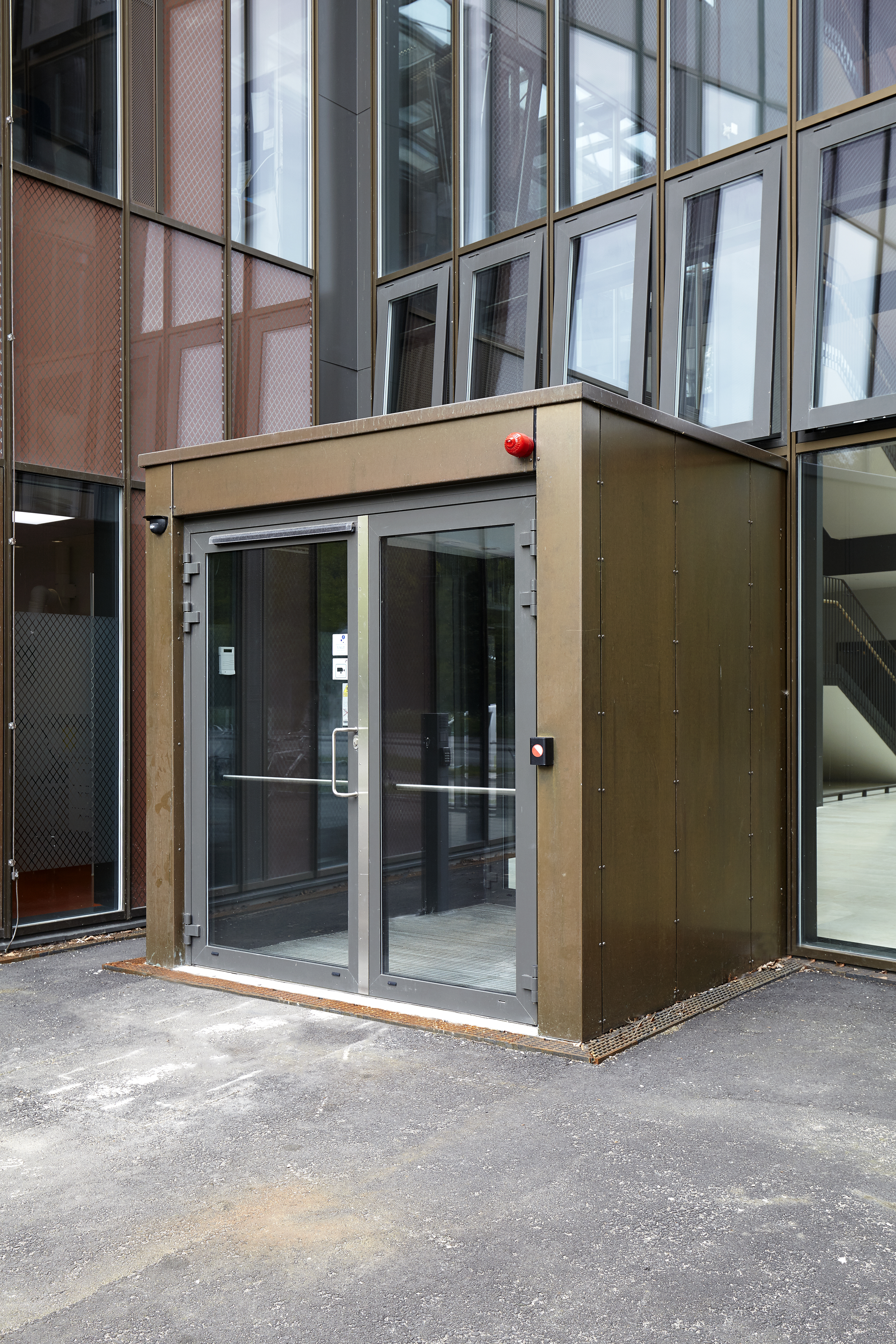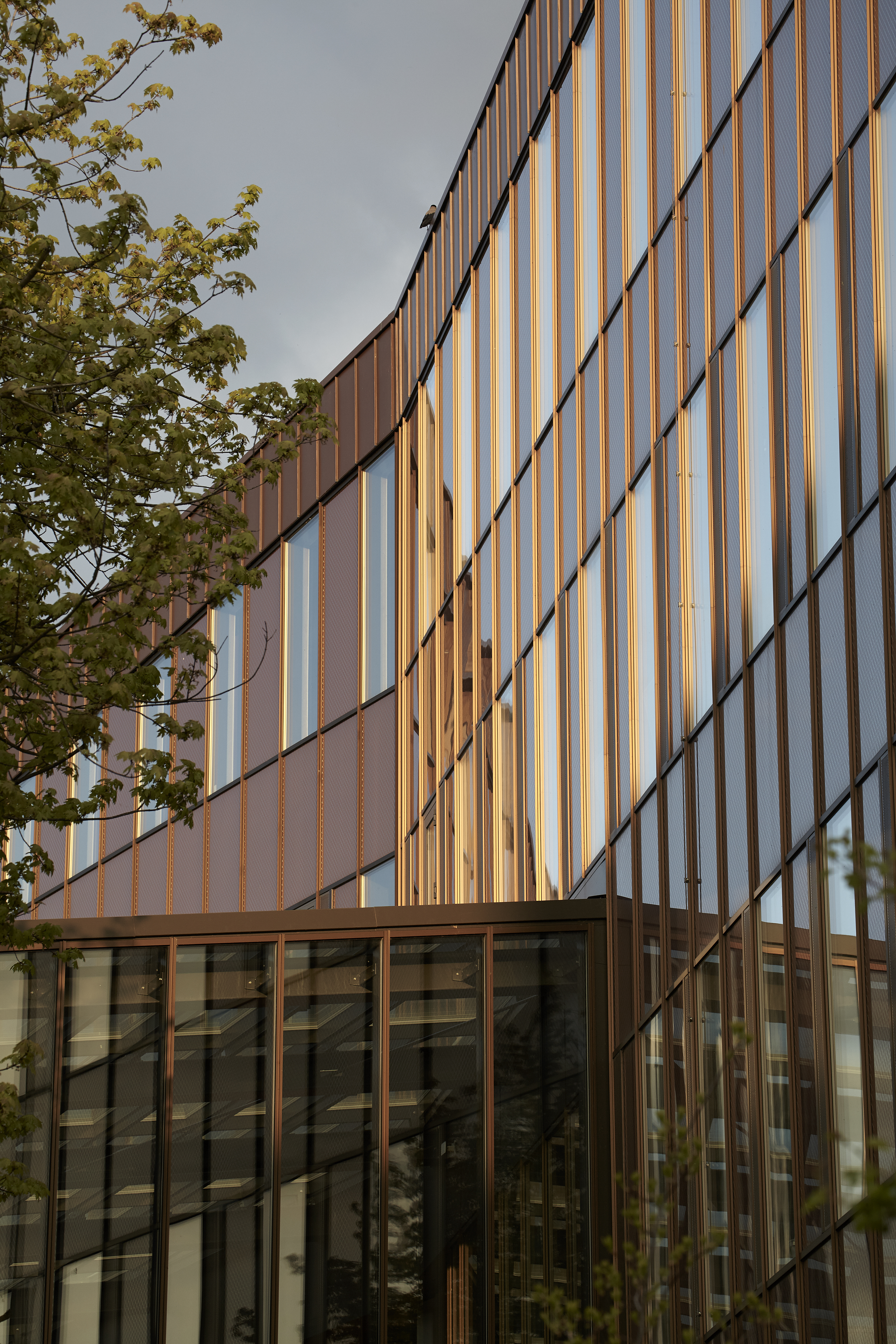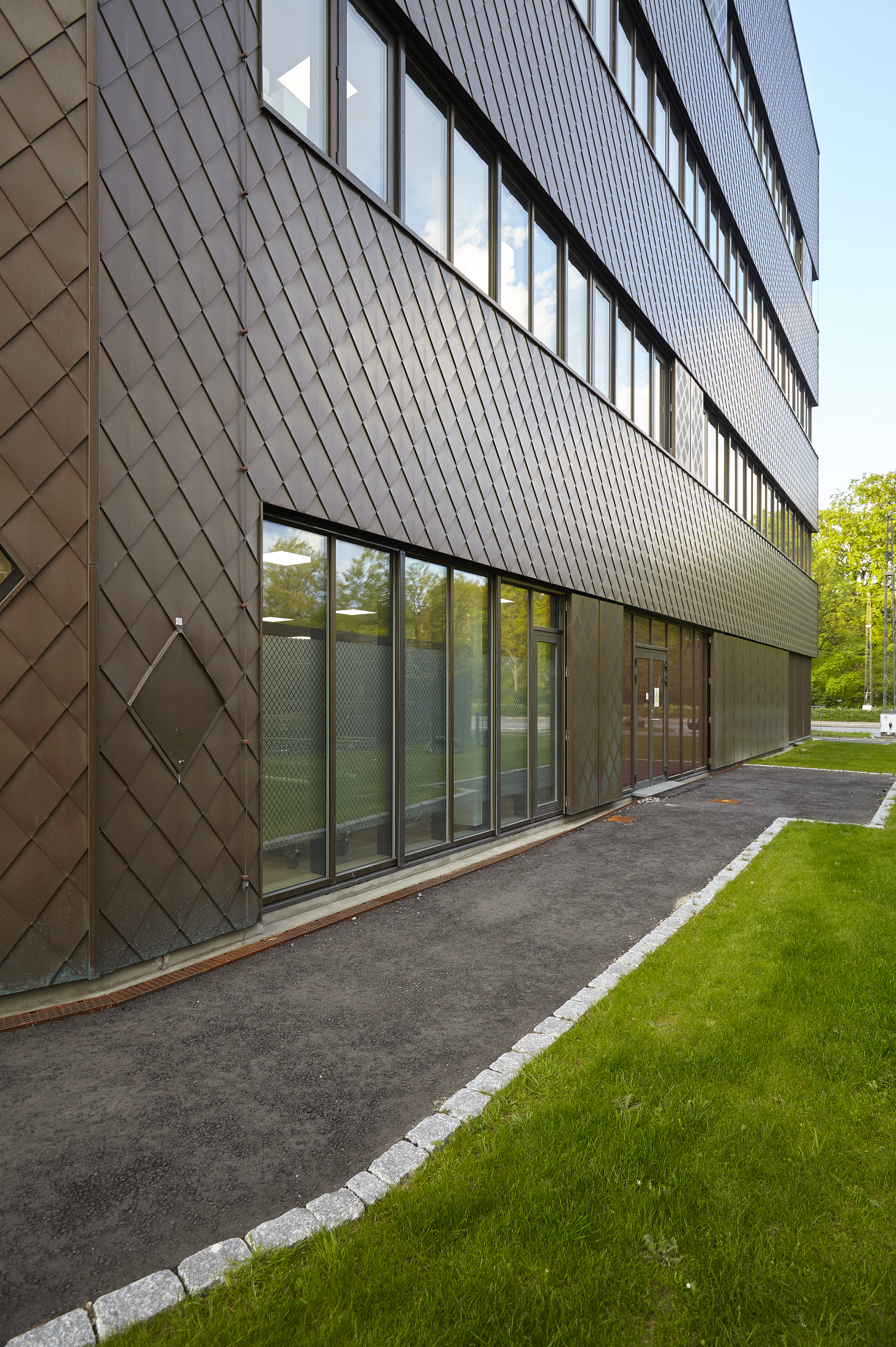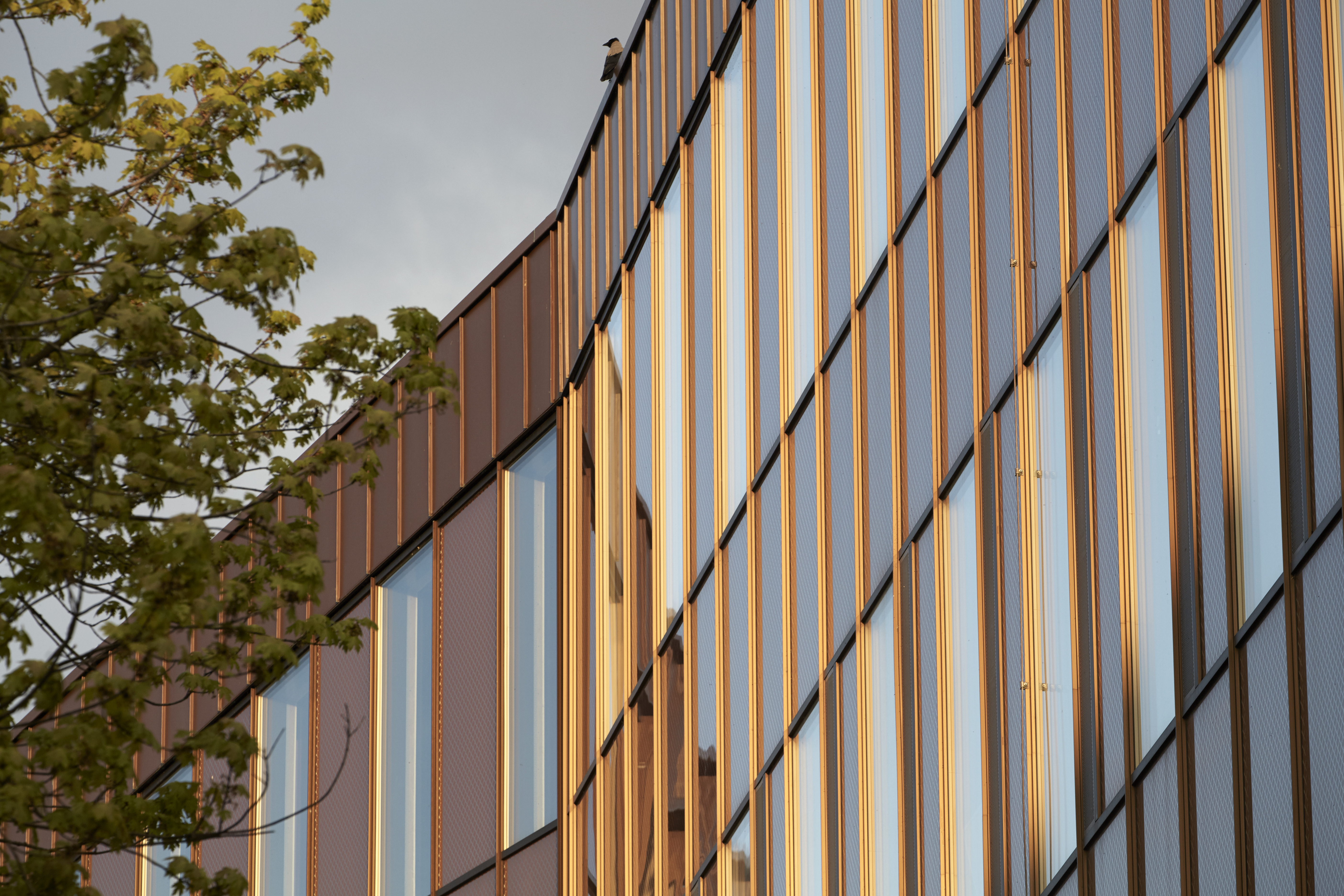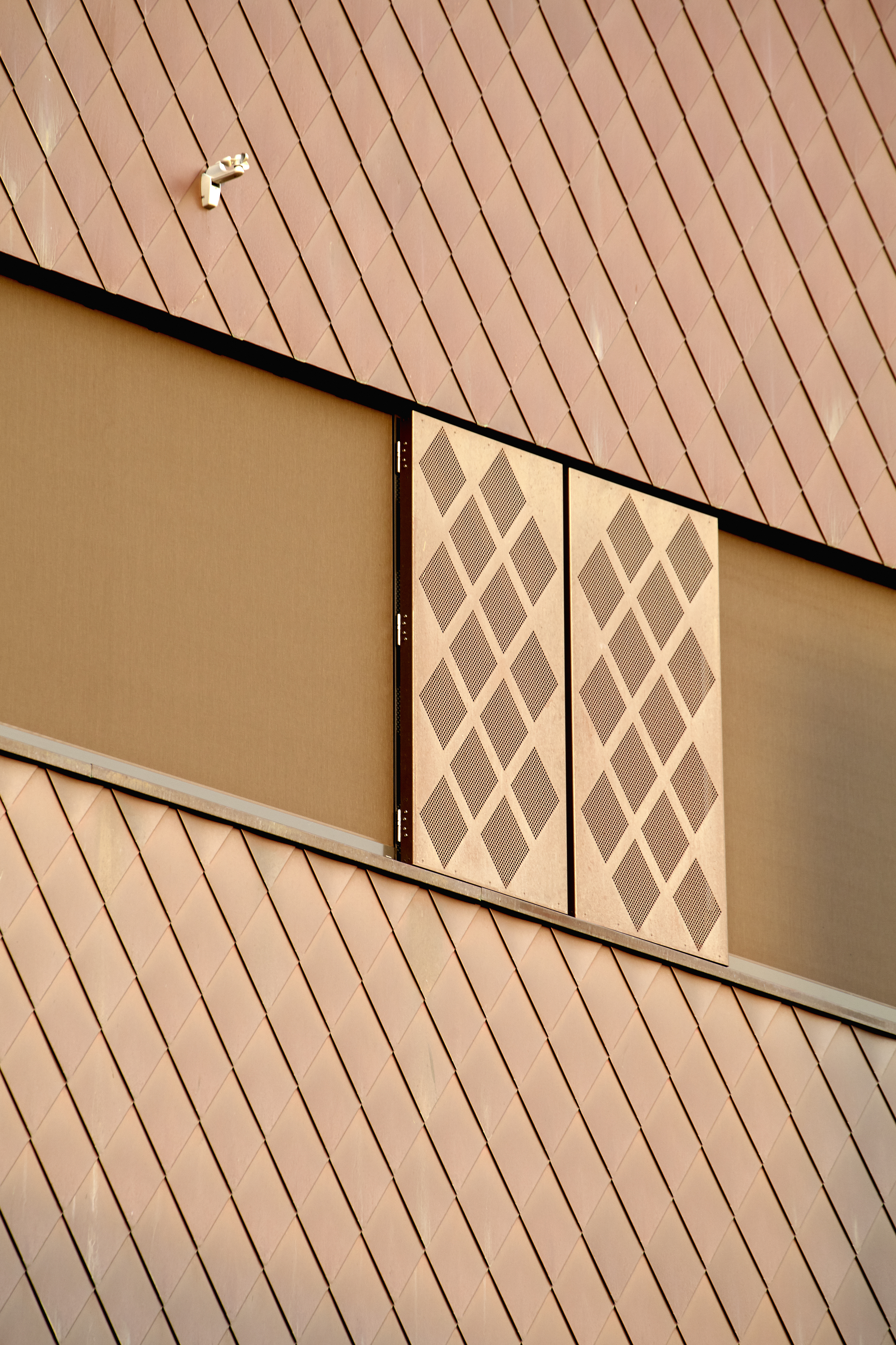 The facades of the building is clad in Tombak CuZn15, which is a KME material, supplied by Metalcenter Group. Fjellsø Entreprise has machined the metal into rhombus shaped shingles, with a thickness of 1 mm. The rhombus shape of the cladding gives the building a geometrical expression, which is also brought out by the golden brown patina of the Tombak material.