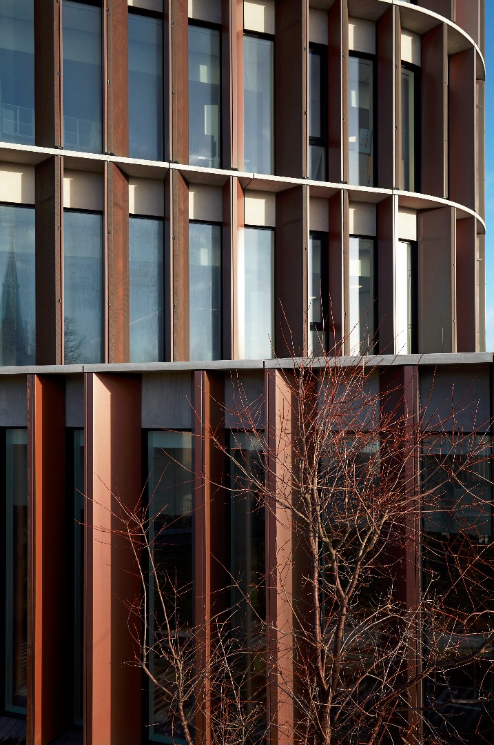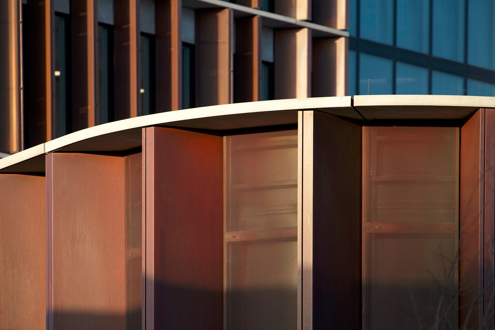 Materiaalin ulkonäön viimeinen silaus syntyy kun kupari on uutena kultaisen väristä, mutta ajan saatossa patinoituu tummemmaksi väriksi. Rakennuksen arkkitehtuurista muotoa tukee elegantisti metalli, mikä takaa Panumille upean ulkonäen myös tulevaisuudessa.