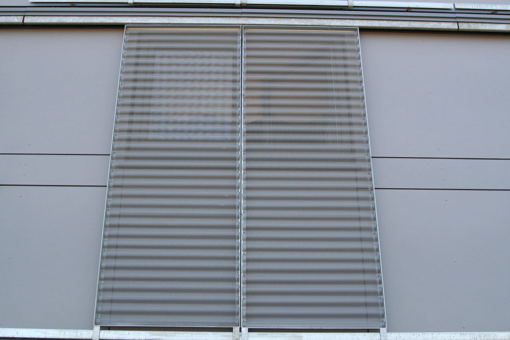 Renovation of 13 housing blocks with 347 apartments. Cladding of facades with lacquered and machined aluminium plates on existing concrete elements. 6 different coloured lacquered plates used.