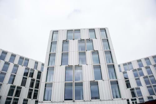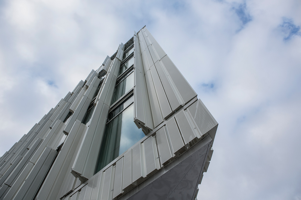 Alumeco´s customer Viking Markiser won the contract on the sunblind of the building and immediately started working developing different possibilities that lived up to the architects´ wishes and the contractors demands. First, a frame construction with perforated plate intended for the shutters. After several tests, the choice fell on a very complicated plate bending solution with fully 14 bends in each shutter and a careful chosen alloying and state. This solution plaid a part in the required strength, so that they could pass a successful test in the Velux Wind tunnel in Jutland.